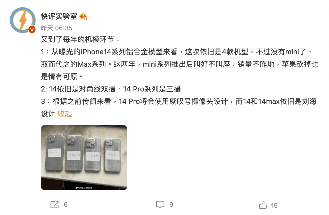 快評實驗室指從曝光的相片可見,iPhone 14 將推出 Max 系列以取代 Mini 系列,認為以近 2 年 Mini 系列的銷量來看,Apple 不推出 iPhone 14 Mini 也是情有可原。他又稱 iPhone 14 系列依舊採用對角線雙鏡頭設計而 iPhone 14 Pro 系列則是 3 鏡頭設計,並指 iPhone 14 Pro 將使用打孔式鏡頭設計,而 iPhone 14 和 iPhone 14 Max 依舊使用「M 字額」瀏海設計。