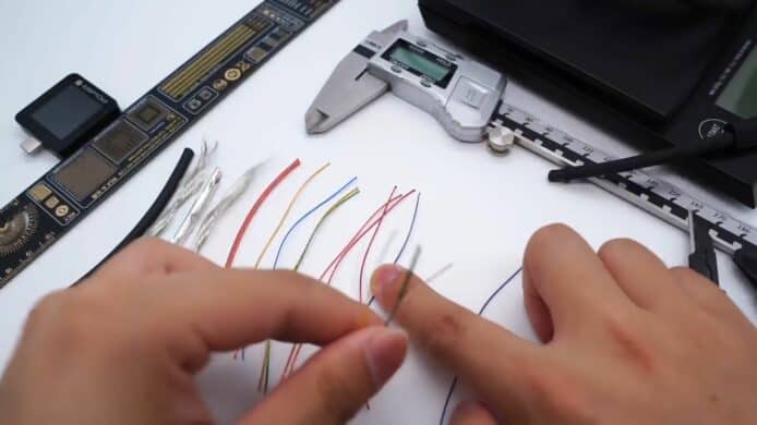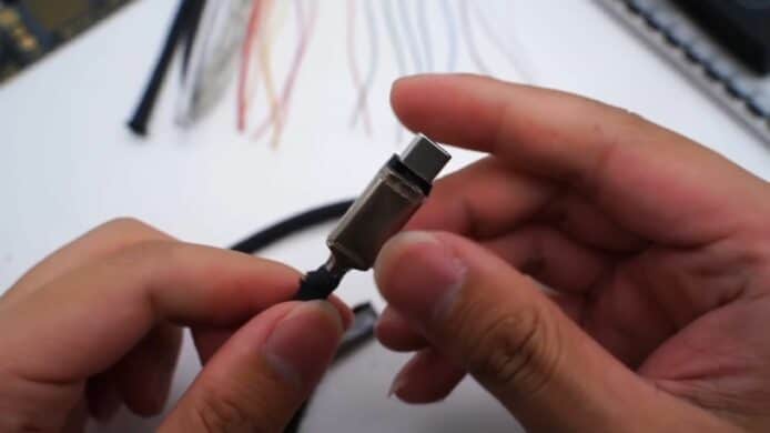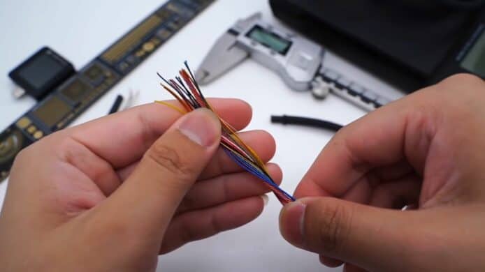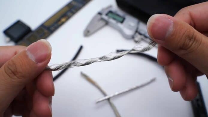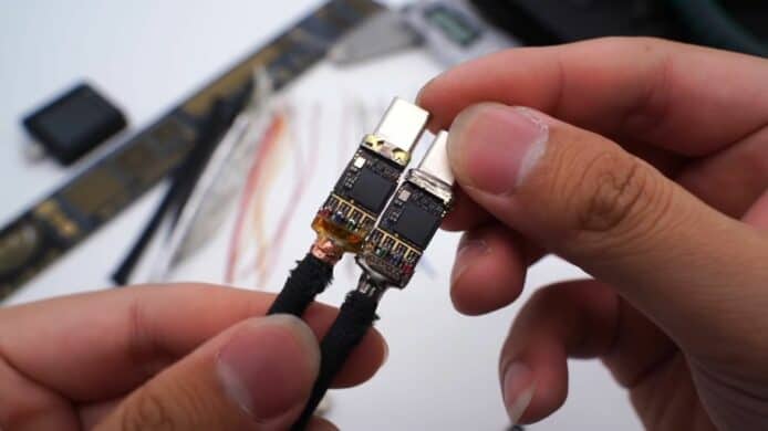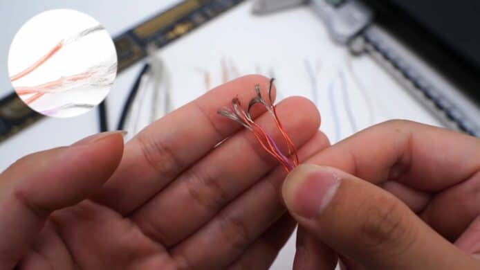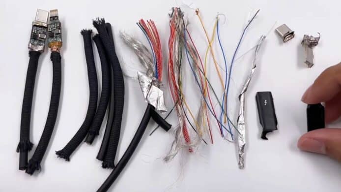 媒體 ChargerLAB 在 YouTube 發表了一段關於拆解Thunderbolt 4 Pro 連接線(1.8米)的影片,這條線在香港也賣到HK$949。開始從外部拆解連接線,發現它用上了防水防塵的編織外皮,這個編織層採用了一種熱塑性彈性材料 TPE 與附有遮罩功能的薄膜,將電線重重包裹。拆開後可發現裡面共總包住了 19 條電線,其中有 5 條線用於供電的鍍錫銅線,其他線都用上純銅,或者鍍銀材料,另外還有 2 條白色塑膠材質包裹住的電線,用於 USB 2.0 傳輸、並兼容 Thunderbolt 3。