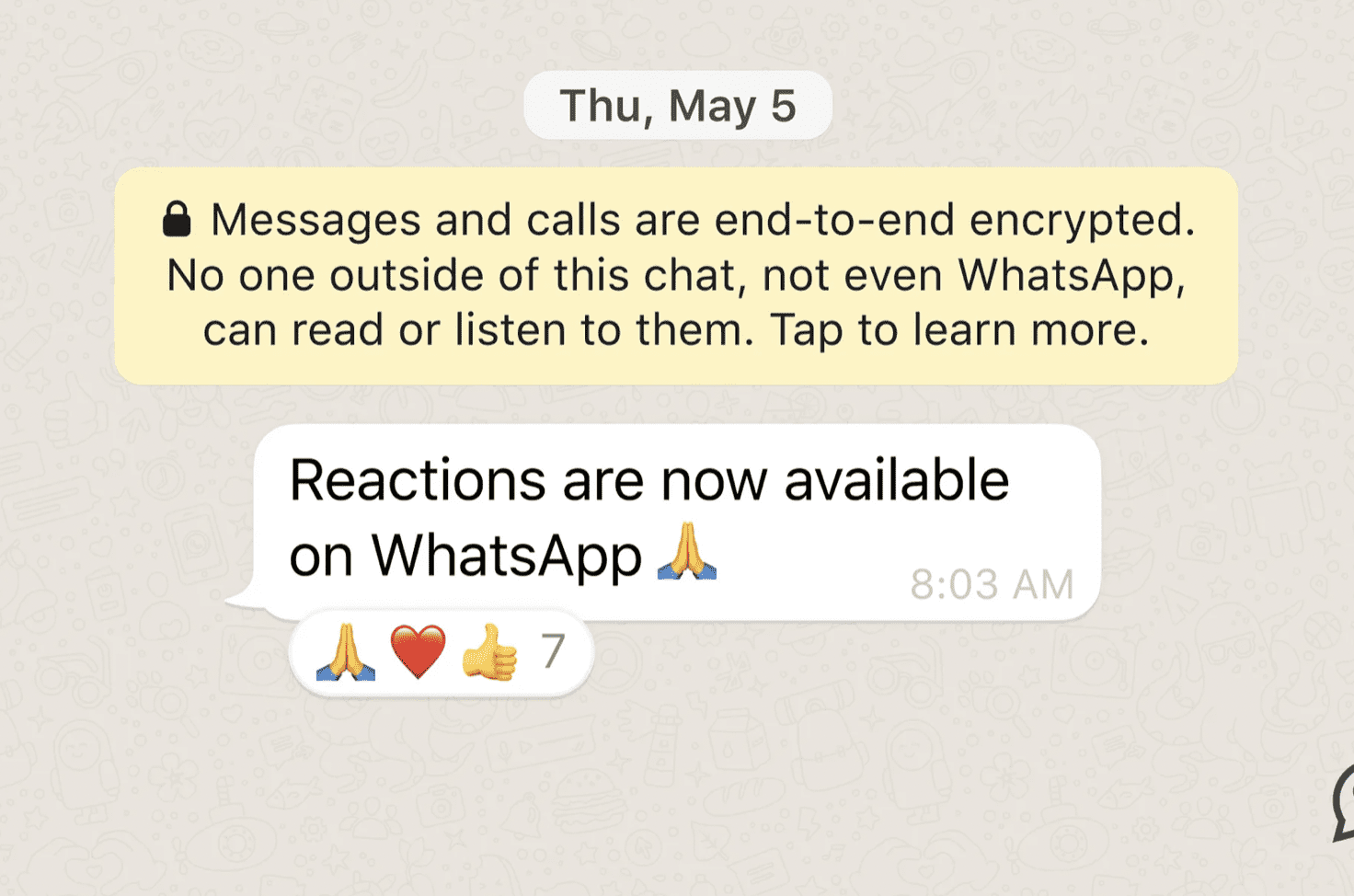 早前若 WhatsApp 用戶想以表情符號回對別人時,需先接下訊息欄才可揀選喜歡的表情符號送出。在WhatsApp 新增的 Emoji Reactions 功能可讓用戶直接長按對方的訊息氣泡,便能選擇合適的表情符號回應對方,而對方亦會因用戶的表情符號回應收到通知。不過與 Instagram、Telegram、Messenger 競爭對手相比,WhatsApp 推出 Emoji Reactions 的速度明顯較晚。