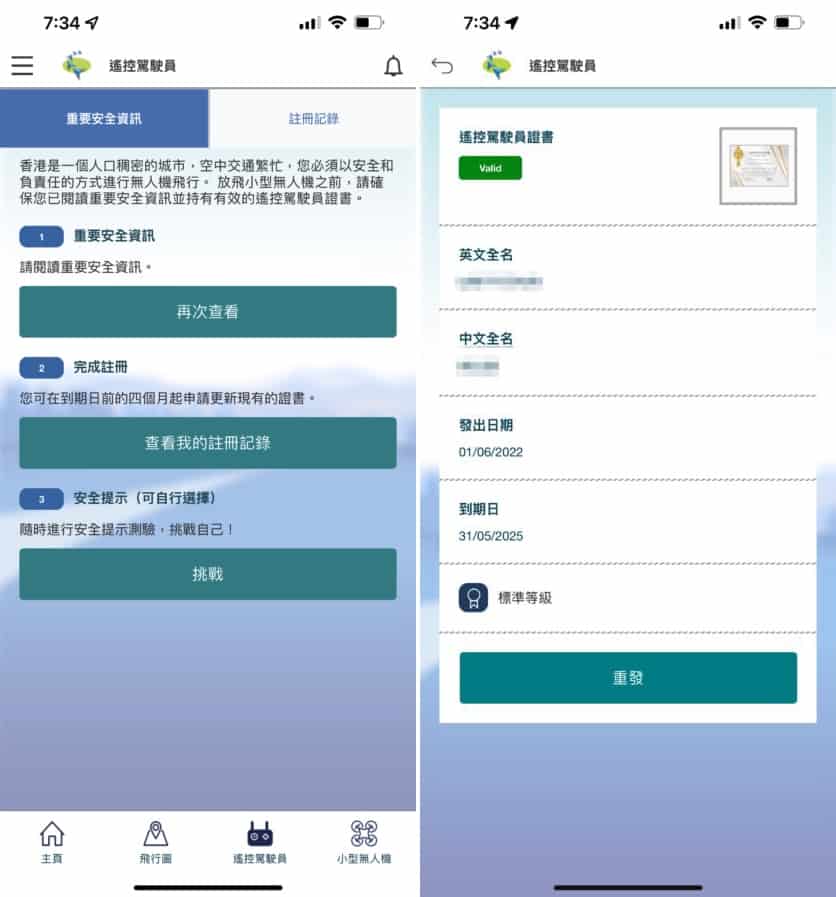 在民航處「SUA 一站通」手機應用程式內,進行個人用戶登記,並閱讀所有畫面出示過的規則簡介與飛行建議,就可成為「標準等級」的註冊遙控駕駛員。毋須參加任何實習或考試,只要在 App 內看完 30 幾張圖便可,只需要約十分鐘就能完成整個過程。