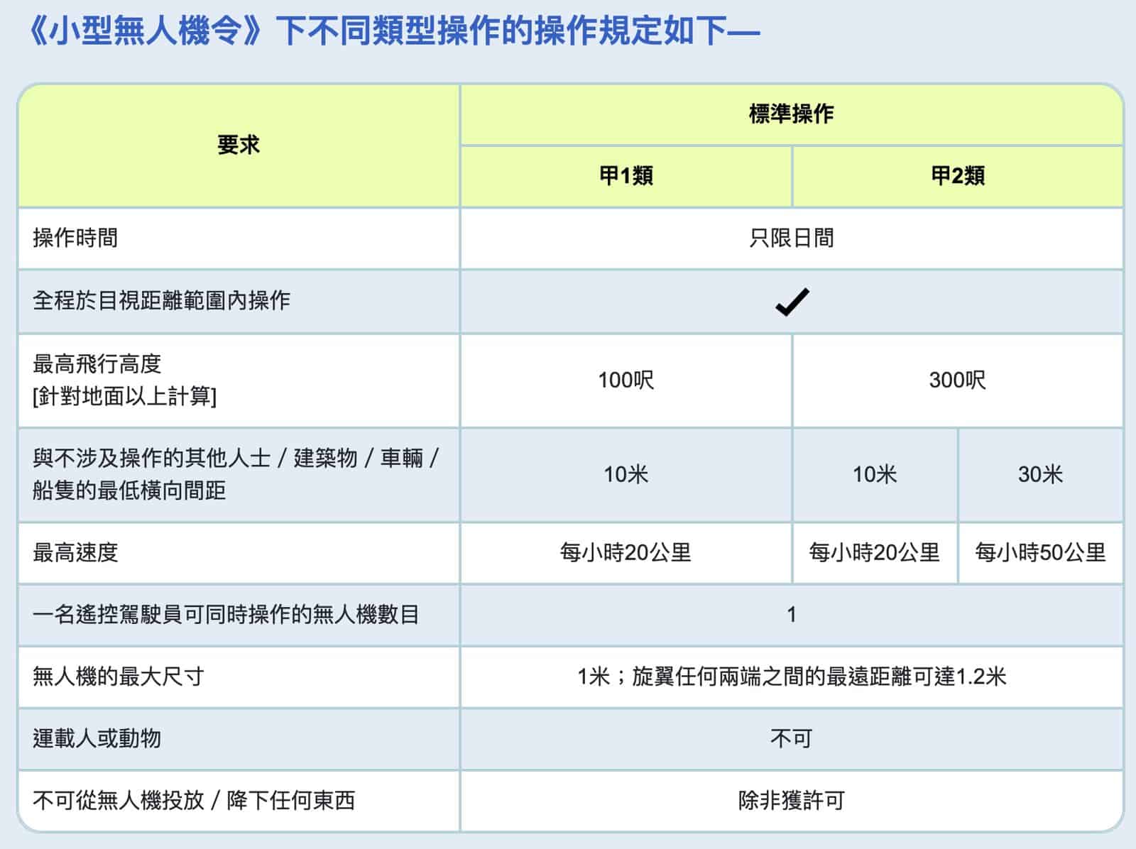 即是說,如果你不進行進階操作,你飛行的無人機屬於甲 1/甲 2 類,而飛行時又遵守甲 1/甲 2 類的操作規則,就毋須通過遙控駕駛員培訓以及考核。