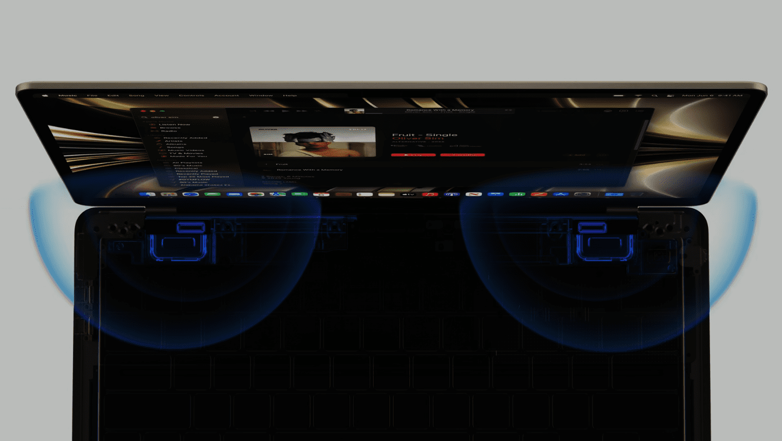 至於音效方面,全新的 MBA 在輕薄機身設計下,仍然內建了四揚聲器系統,當中設有 2 個中高音及 2 個低音單元,更支援空間音訊,瀏覽電影時應該有不錯的聽覺享受。