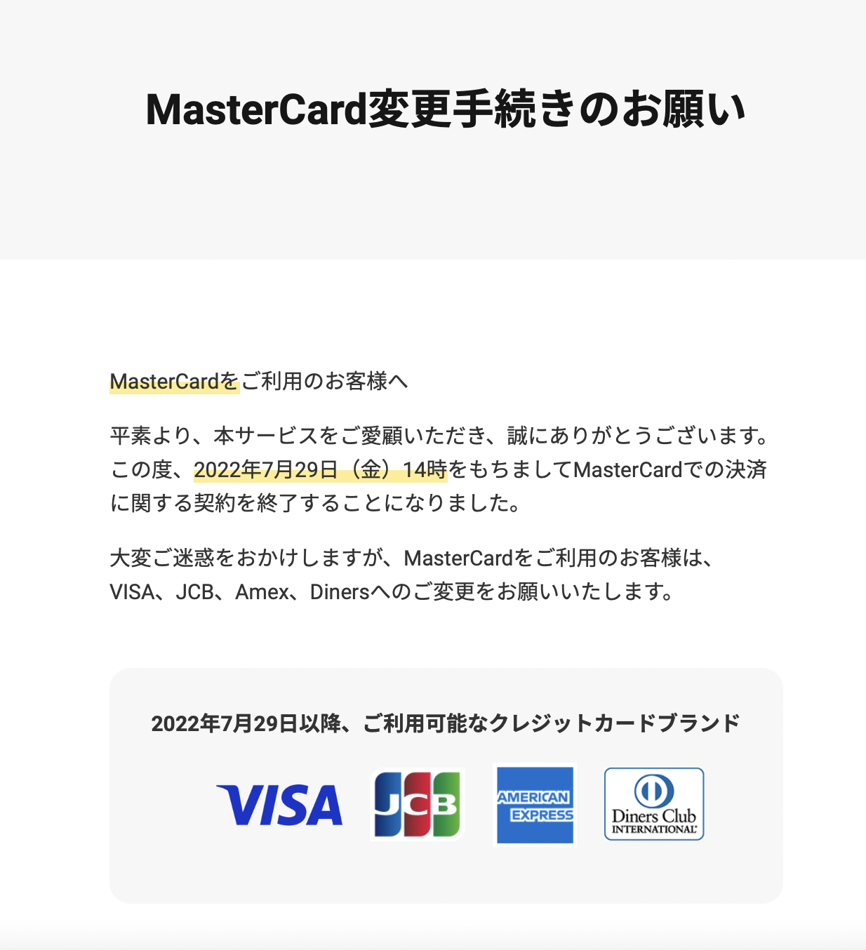 日本電子商務公司 DMM 及旗下成人平台 FANZA 在周三(20 日)分別在官方網站發表聲明,指由於 FANZA 與 Mastercard 的支付合約已結束,因此由下周五(29 日)起,FANZA 將停止接受 Mastercard 的支付方式,建議用家改用 Visa、JCB、Amex 或 Diners 的方式支付。