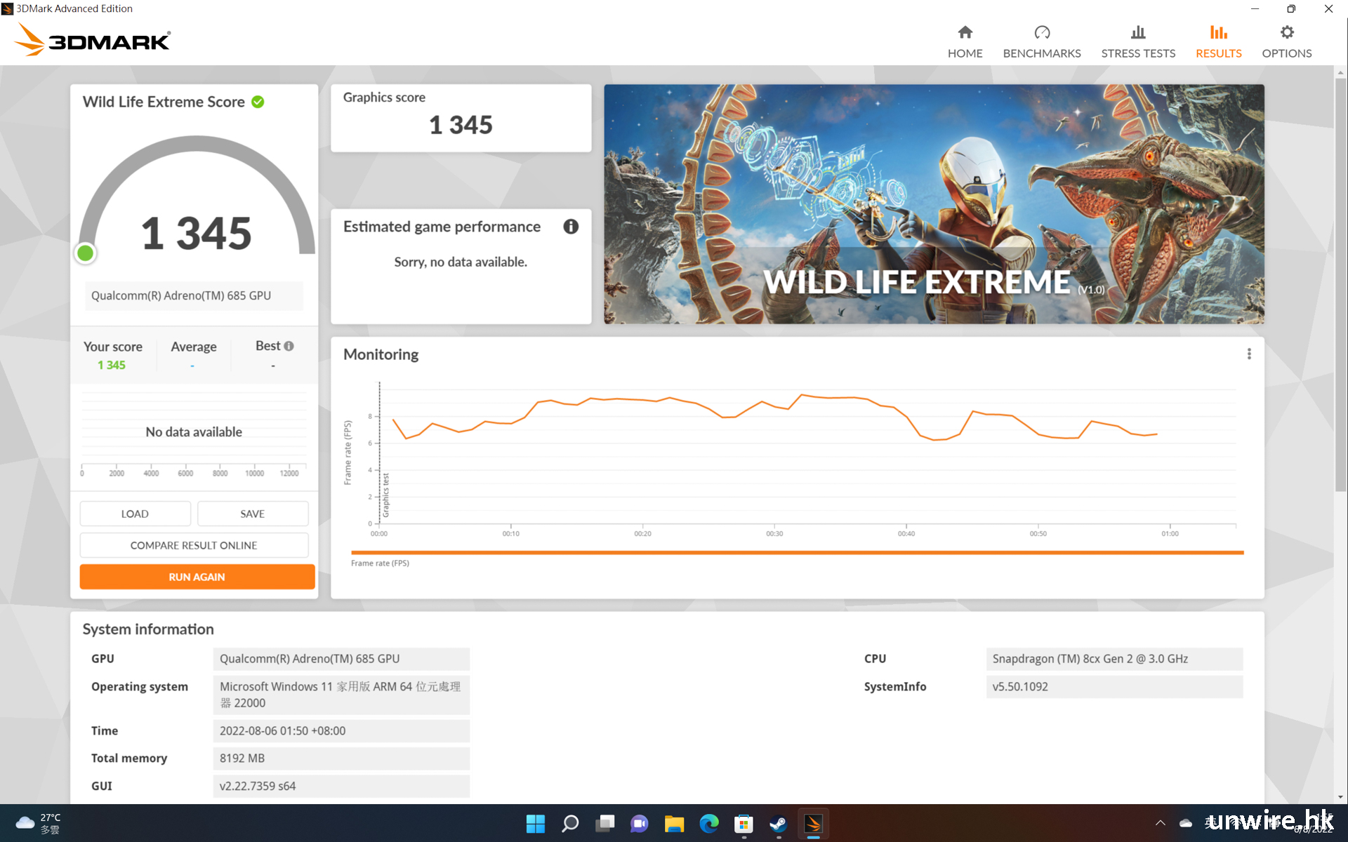 ▲筆者再以 3DMark 測試小米 Book S 12.4″ 的圖像處理表現,結果它只可運作到 Wild Life Extreme 測試,而且只有 1,345 分,由此可見以筆電來說,它最多只能用作文書機。