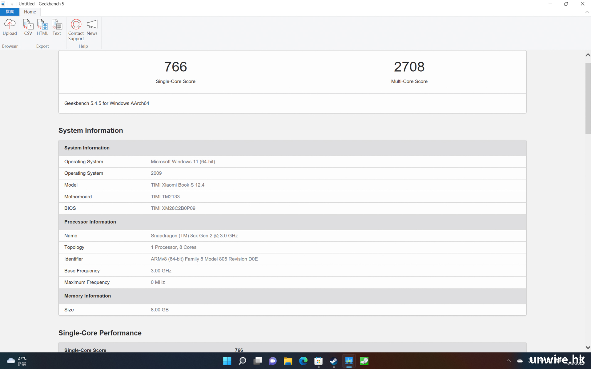 ▲筆者先以 Geekbench 5 測試處理器表現,結果單核及多核運算只測出 766 分及 2,708 分,只屬一般。