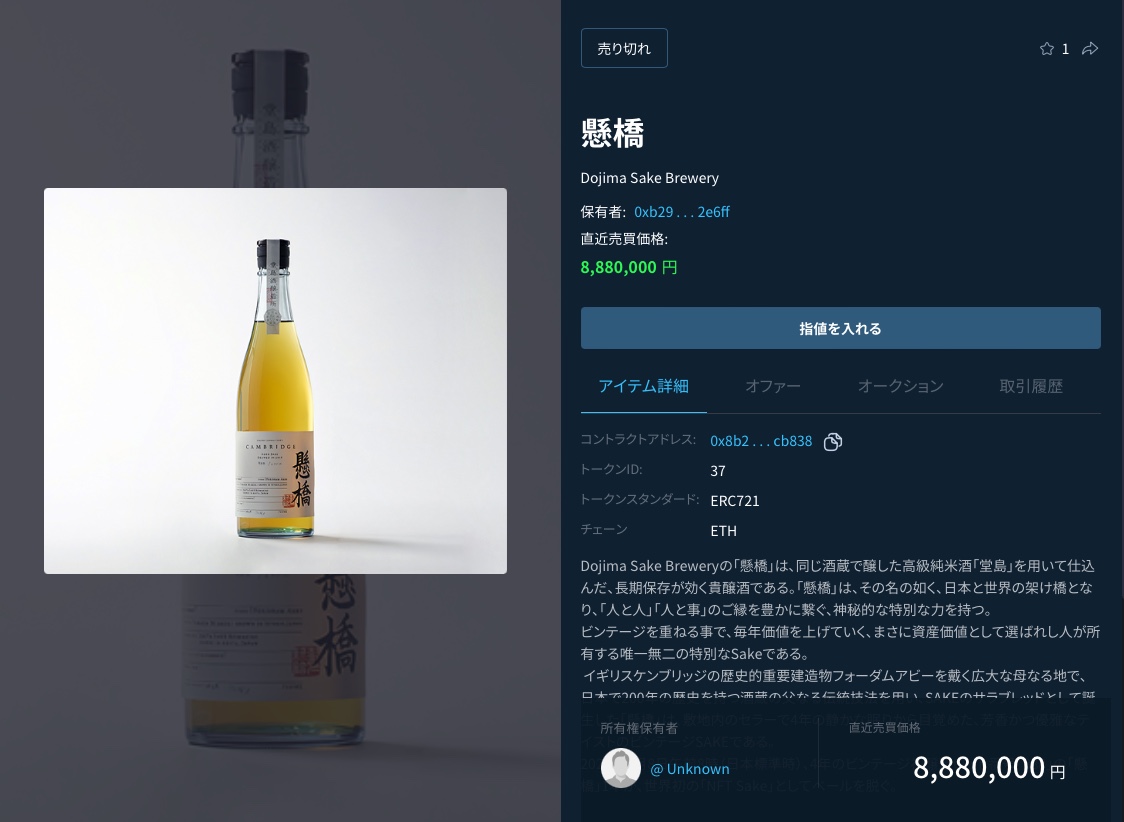 這個 NFT 的原型,由日本大阪市企業「堂島麥酒釀造所」在英國設立的酒莊「Dojima Sake Brewery」所製造的日本酒《懸橋》實物本來就相當珍貴,在全球酒收藏界也是難以入手的稀品。《懸橋》日本酒 NFT 亦同樣成為了炙手可熱之品,NFT 代表了不能取代的證明,表現這支酒的真確性,而且這個 NFT 裡面《懸橋》酒的序號是「888」,令它更為珍貴。