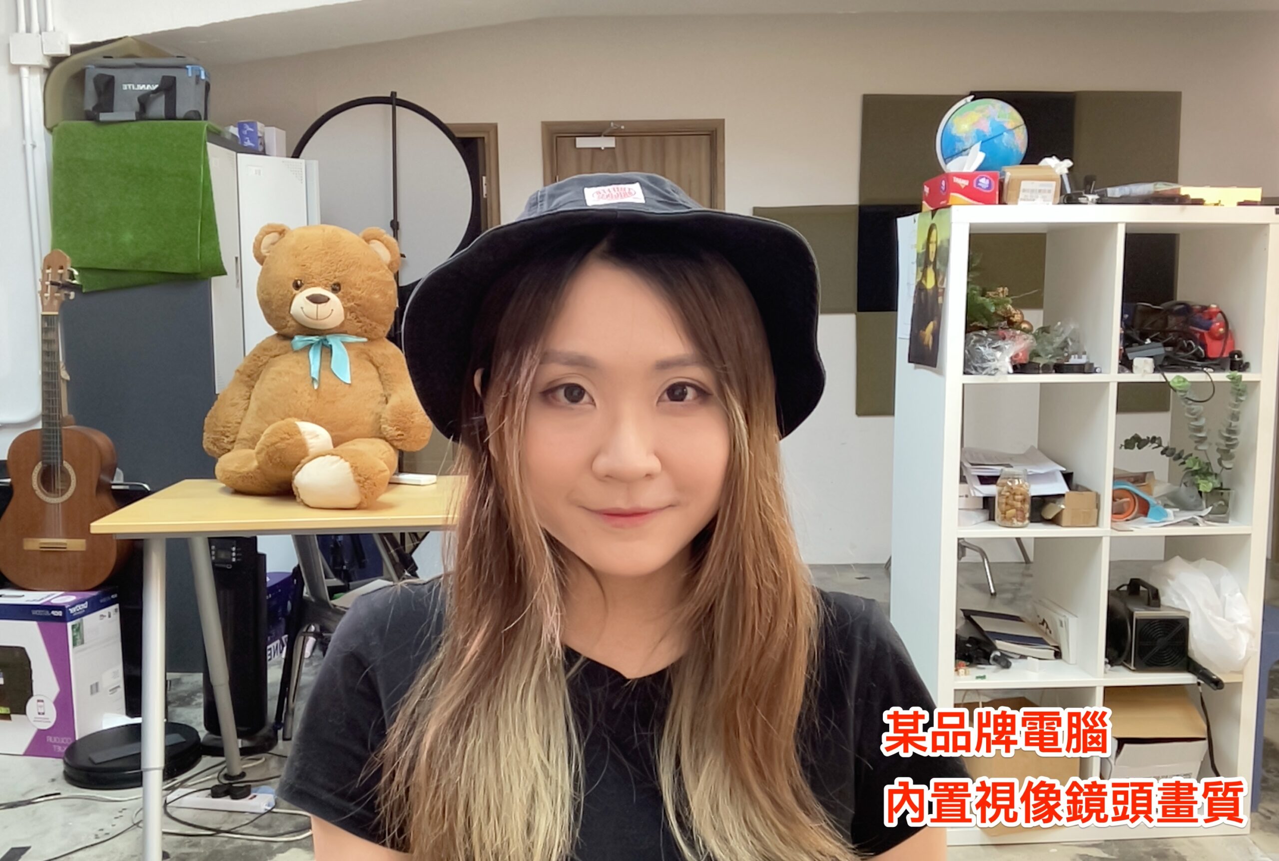 我們先用 Insta360 Link 的 4K 畫質同一般電腦的內置視像鏡頭比較。其實已經看到畫質上的分別。我們可發現人物上的頭髮絲的細緻度好出太多。小編亦發現此機的白平衡、色彩度都特別比電腦內置的視像鏡頭好。而下面的例子看到背後的小熊、結他、書櫃好像較模糊,其實是因為人物在前景所產生的淺景深效果,這些效果一般在數碼相機才會出現。