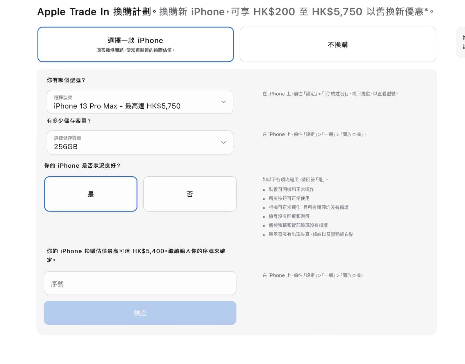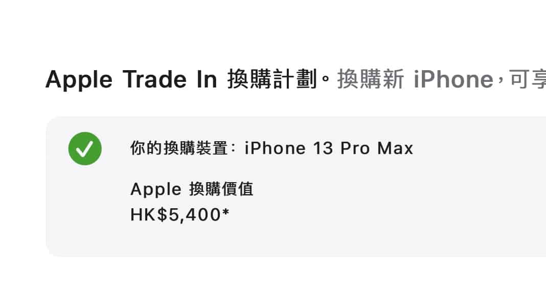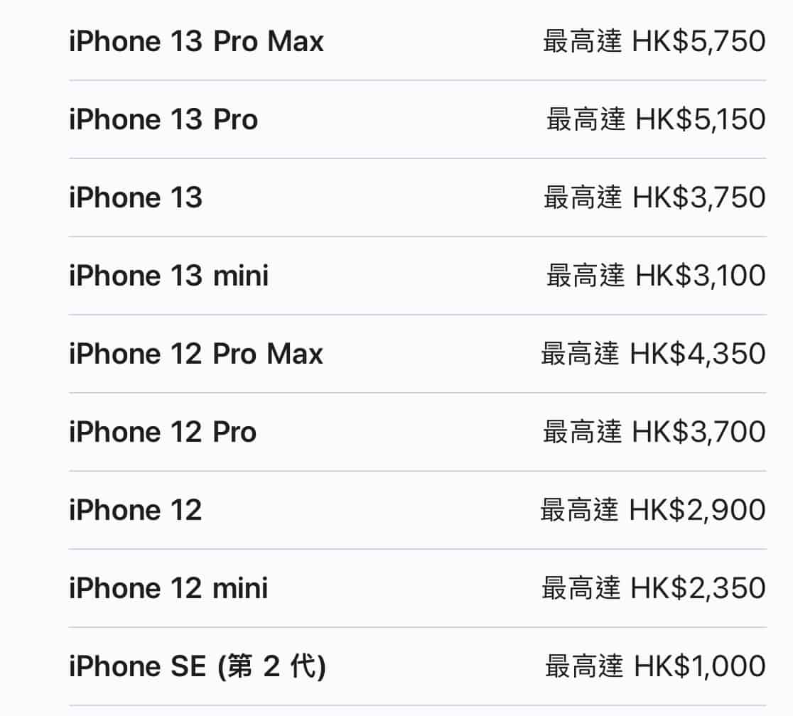 在選購 iPhone 時,你會到達一個選項,問你是否要換購 iPhone(也就是 Trade In)。按「選擇一款 iPhone」再選擇型號、儲存容量,回答 iPhone 的狀態是否良好,就可顯示出你手頭上 iPhone 的最高回收價(實際回收價需要看手機的狀況,包括外觀而定)。小編輸入一部 256GB iPhone 13 Pro Max 的序號後,發現其回收價可達 HK$5,400。小編以相同手法,調查了其他型號的 iPhone 回收價如下: