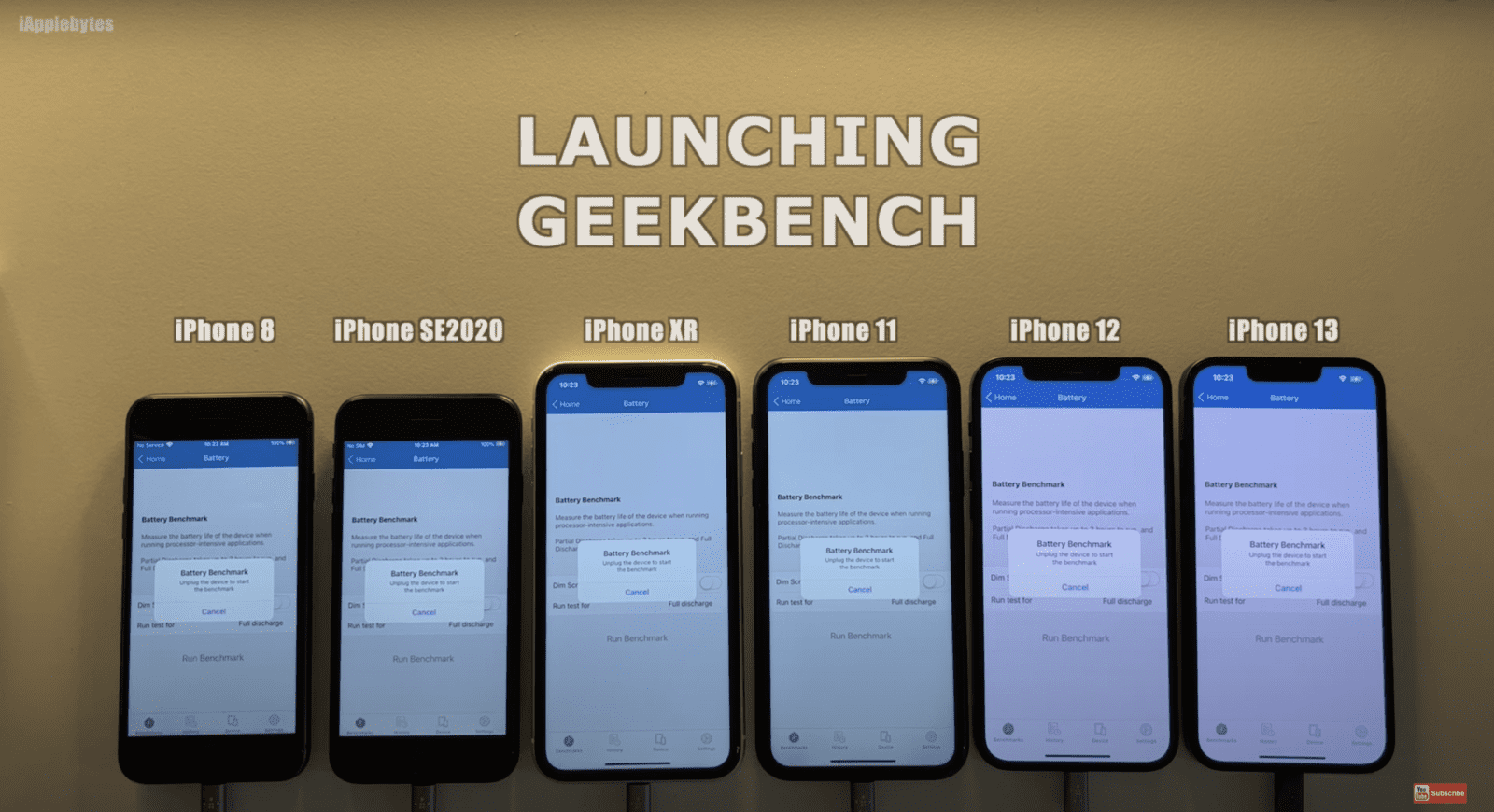 外國 YouTube 頻道 iAppleBytes 早前以 iPhone 8、iPhone SE 2020、iPhone XR、iPhone 11、iPhone 12 及 iPhone 13,共 6 款舊型號的 iPhone ,再配合 Geekbench 來測試 iOS 16 正式版的電池由滿電至完全耗盡的續航時長。