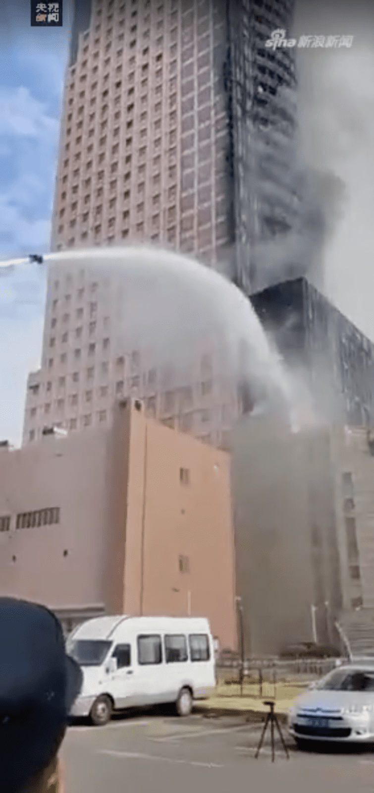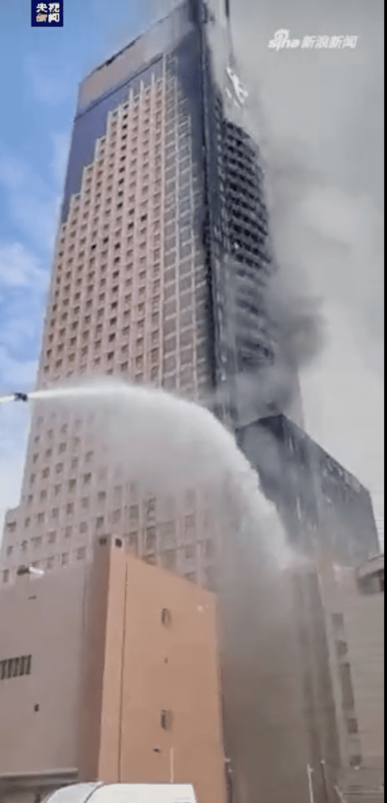 從目擊者錄影片段可見,涉事的中國電信大樓在下午突然起火,數十層樓體燃燒劇烈,火勢濃煙幾乎漫延至整座大樓,甚至有火球由高空墜落。
