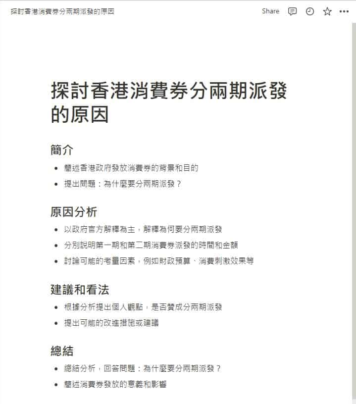倘若你想撰寫一篇探討香港消費券為甚麼要分兩期派發的文章,但不知道該怎麼為文章設定框架,你可以用 Notion AI 助你一臂之力。