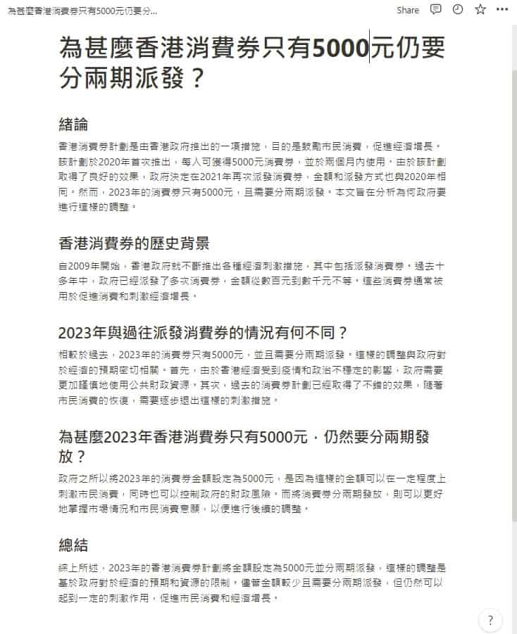 小編叫 Notion AI 寫一篇分析為甚麼香港消費券只有5000元仍要分兩期發放的文章。