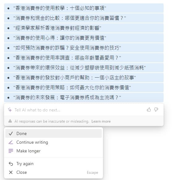 倘若你想撰寫有關香港消費券的文章,但不知從何入手,你可以用 Notion AI 的Brainstorm 功能。