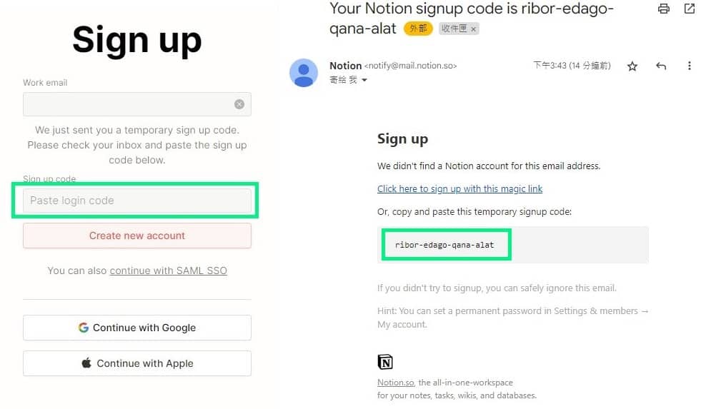 ▲ Notion 會傳送驗證碼至剛才填寫的電郵地址,複製右圖綠框的驗證碼至左圖的「Paste login code」裏,再按粉紅色的「Create new account」按鈕