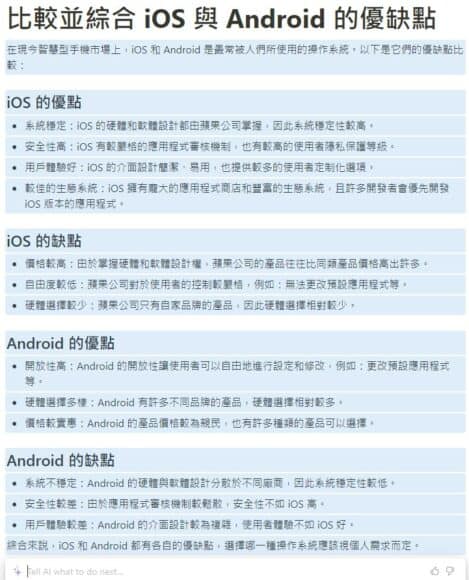 Notion AI 會幫你列舉出各種選擇的優點和缺點,供你參考。