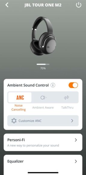 操控方面頗為簡單,亦跟其他廠的設定類似,單次按下右邊可以暫停或播放音樂,按下左邊則是切換主動降噪或通透模式。Tour One M2 有自家應用程式,用家可以下載 JBL Headphone,調整主動降噪的程度、EQ 、切換音樂或影片模式、安靜模式等。