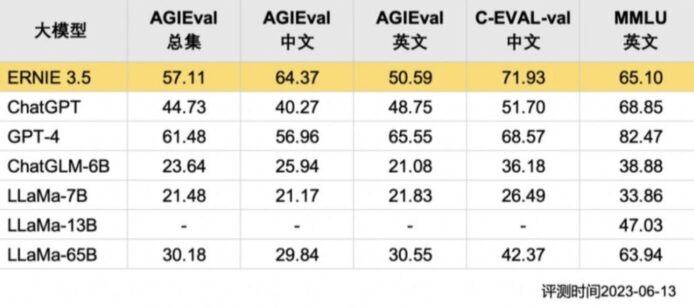百度董事兼行政總裁李彥宏表示,文心一言的新版本名為「文心大模型 3.5」,在本月 13 日和 ChatGPT-3.5、GPT-4 在内的 6 個現有的語言機械人模型進行 AGIEval、C-Eval 和 MMLU 三個權威評測。20 日,百度公佈一份測試報告,顯示文心大模型 3.5 的綜合能力超越了 ChatGPT,特別是中文能力方面表現優異。