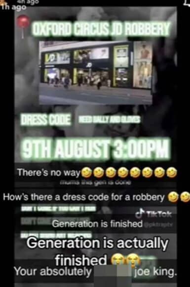 當日事發前 Tiktok 廣泛流傳一則名為「搶劫 JD Sports」的帖子,呼籲網民在當天下午到牛津街「搶劫」JD Sports 和其他商店,要求參加者遵守戴面罩及手套的裝束要求,並提醒不要攜帶任何武器,警告參加者「若逃不掉就別來」。