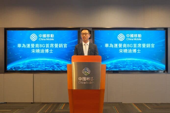 ▲中國移動香港董事兼行政總裁李帆風先生及華為運營商 BG 首席營銷官宋曉迪博士在發佈會中宣佈已完成合作建構的 5G Advanced 網絡技術在香港實驗室的網絡測試及驗證。