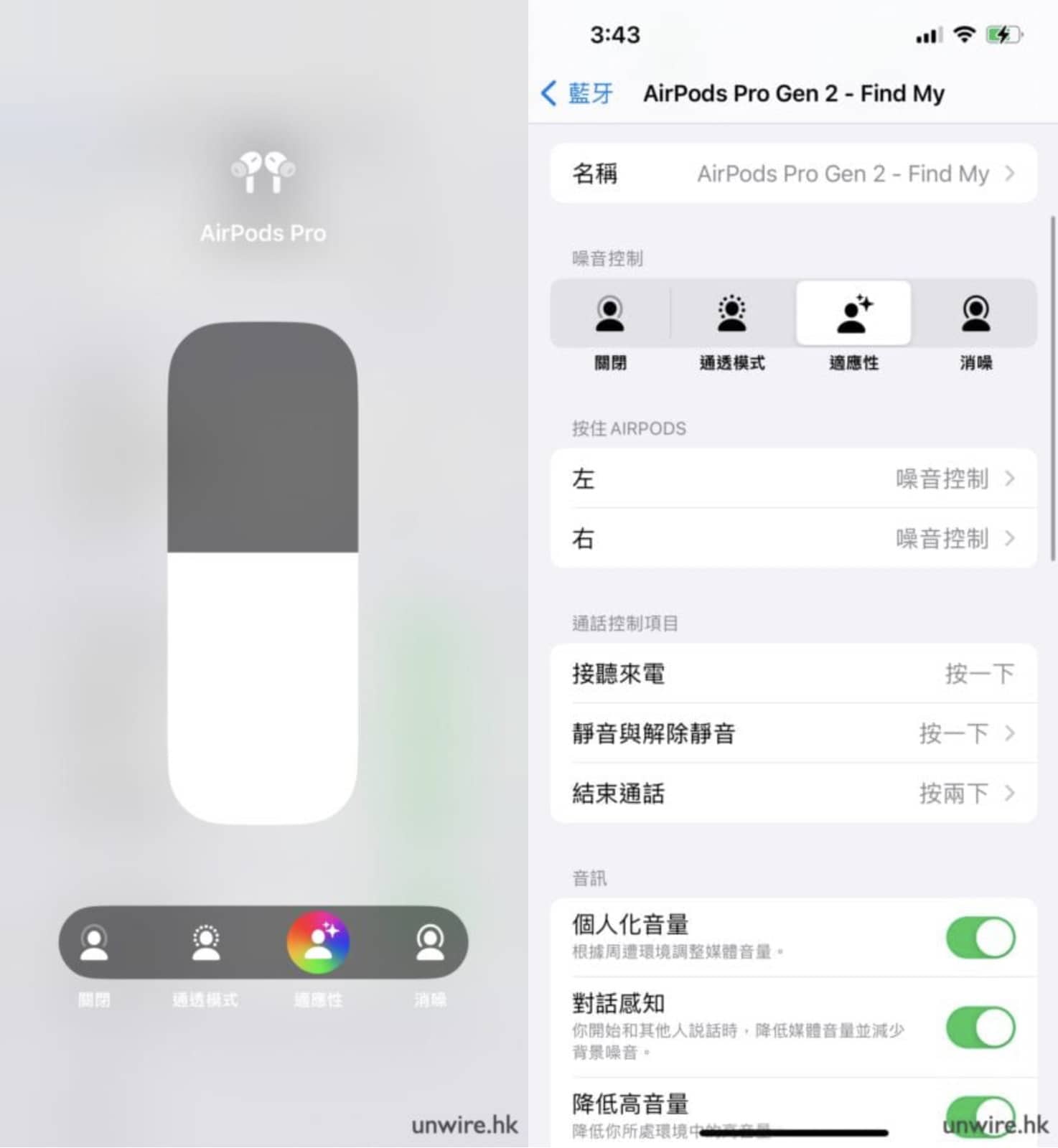 不論是今次新出的 USB-C 版 AirPods Pro 2 還是早前推出的 AirPods Pro 2,都能夠在全新 iOS 17 中享受到最新「適應性音訊」。「適應性音訊」包含了三大功能,包括「適應性模式」、「個人化音量」,還有「對話感知」。