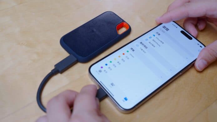 此外,現在 iPhone 15 也能如 iPad 一樣,連接 SSD 後就能直接載入 iPhone 內的檔案,不用再連接轉插,iPhone 亦可以直接存取 SSD 內的檔案。