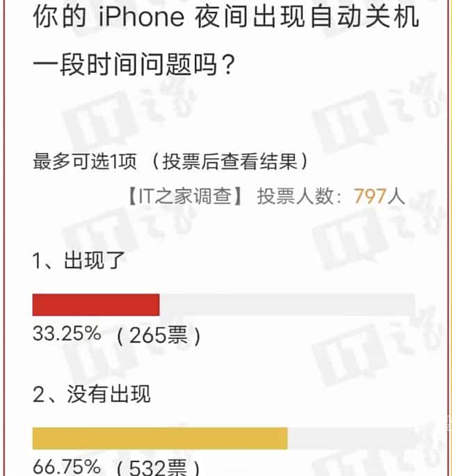 中國有網民發起投票,問網友是否經歷過 iPhone 晚間自動關機的情況,結果竟有超過30%超過250人指他們都有遇過晚間重開機的情況。有網民向Apple查詢,得到的回覆是iOS並沒有晚間自動重開機的功能。