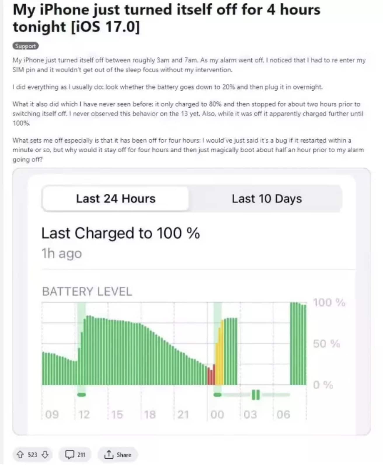 外國亦有網民遇到同類情況。即使是 iPhone 15 Pro Max,在沒有使用電池最佳化的情況,並使用 MagSafe 充電過夜,在夜間充電途中,手機會自動關機並且重新開機。有網民指他的 iPhone 從晚上 3 時至到早上 7 時會自動關機。