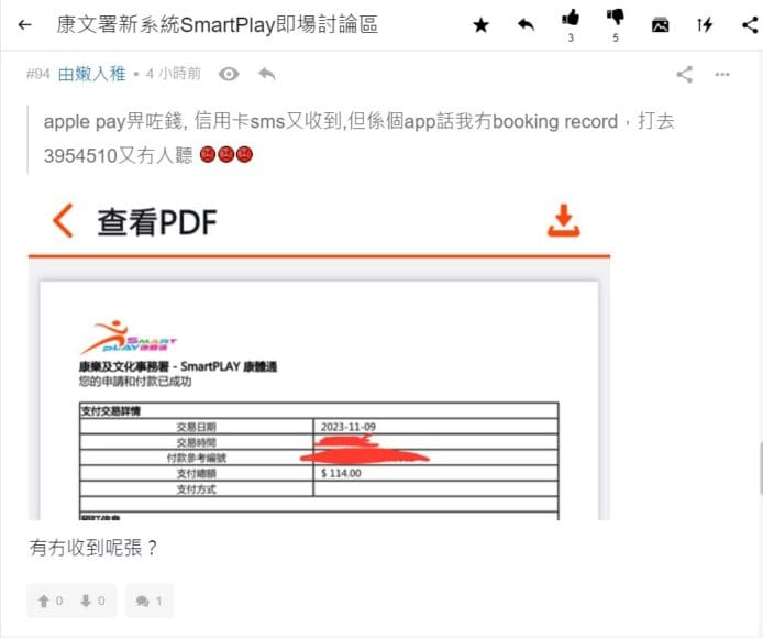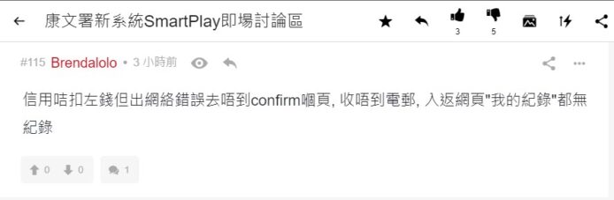 即使成功登入「SmartPLAY」應用程式亦不代表用家已成功預訂場地。LIHKG 討論區有用家「生見愛瑠」及「Brendalolo」均表示自己已支付預約費用,而且收到信用卡公司傳送的付款成功短訊,可是在「SmartPLAY」應用程式上沒有其預約紀錄,撥打查詢熱線亦無人接聽,亦沒有收到預約確認的電郵。下面有熱心網友「由嫩入稚」表示,要收到 SmartPLAY 的確認 PDF 才算預約成功。