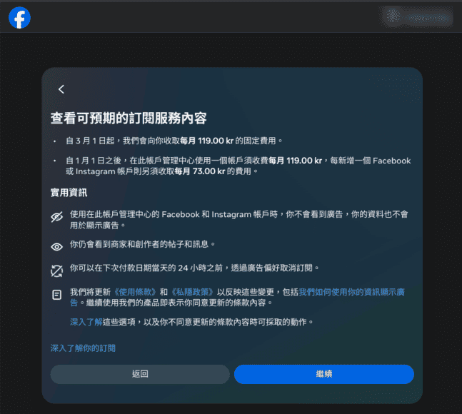 報導指,歐盟的 Facebook 和 Instagram 用戶加入了一個付費服務的選擇,每月透過 App Store 或者 Google Play Store 支付 12.99 歐元(如果透過網上直接付費則需要 9.99 歐元)就可以使用不堪廣告的服務,否則將會繼續顯示定向廣告,也就是追蹤用家各種網絡足跡提供的特定廣告。