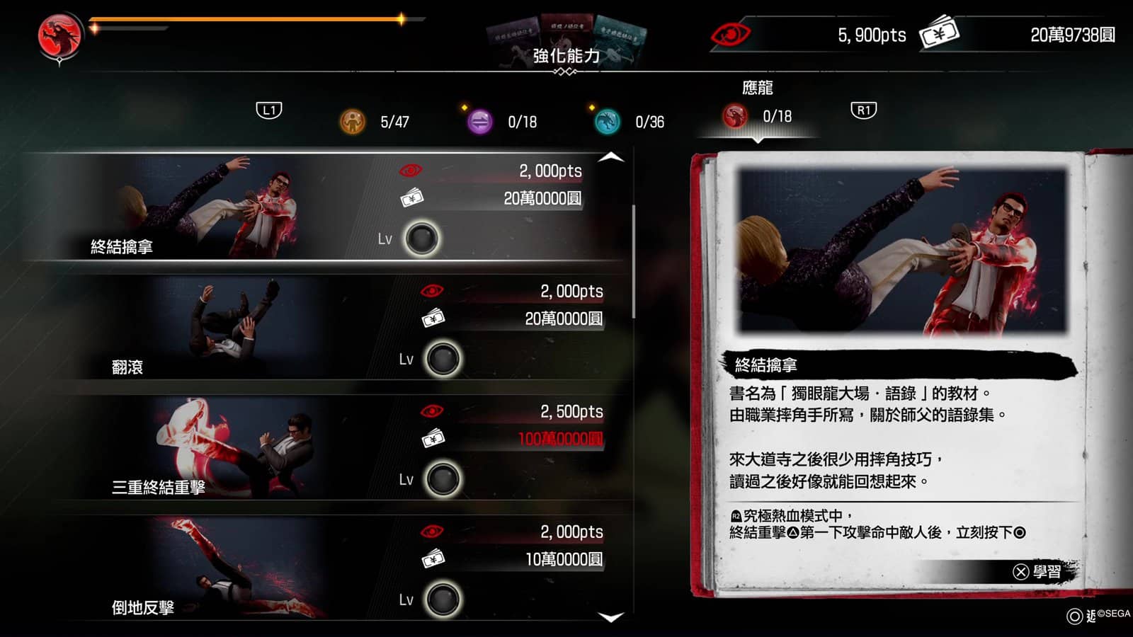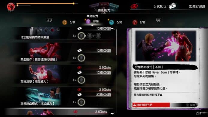在「強化能力」選單中,玩家可花錢升級基礎能力、「特務」戰鬥風格所屬技能、「應龍」戰鬥風格所屬技能,還有兩個戰鬥風格的共通能力。升級簡單直接,總之你有方法搵錢就能馬上變強。