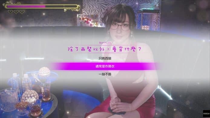 而實際上公關俱樂部的內容十分有趣,玩家如想討好女孩們一定會焦頭爛額。有時選擇一些色色的答案,反而能夠搏得女孩好感。遊戲上玩家每儲滿一條好感棒,就會進入關鍵問題,如此類推答滿 3 條關鍵問題,會有最終性感影片作結。整個內容耳目一新,有種真的去了夜總會一樣的感覺(雖然小編未去過!),看到陰暗主線裡面,在小遊戲中變了另一個人的桐生一馬,總會令人會心微笑。